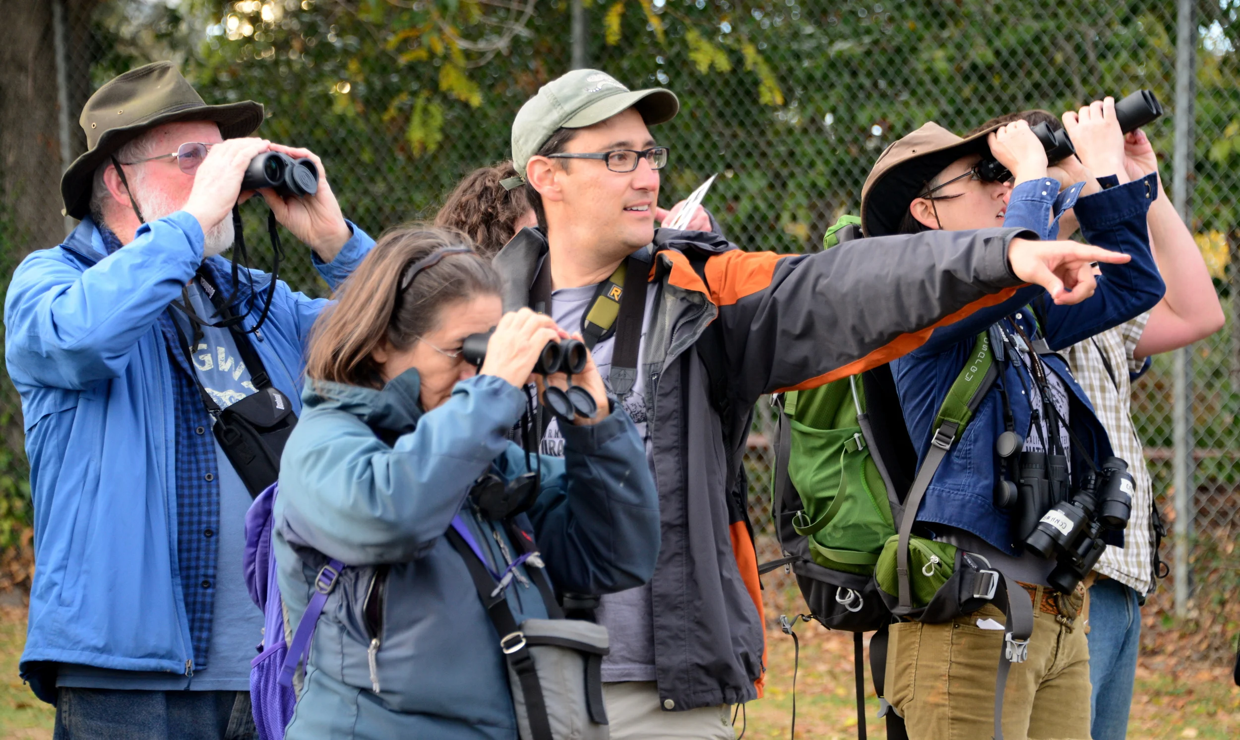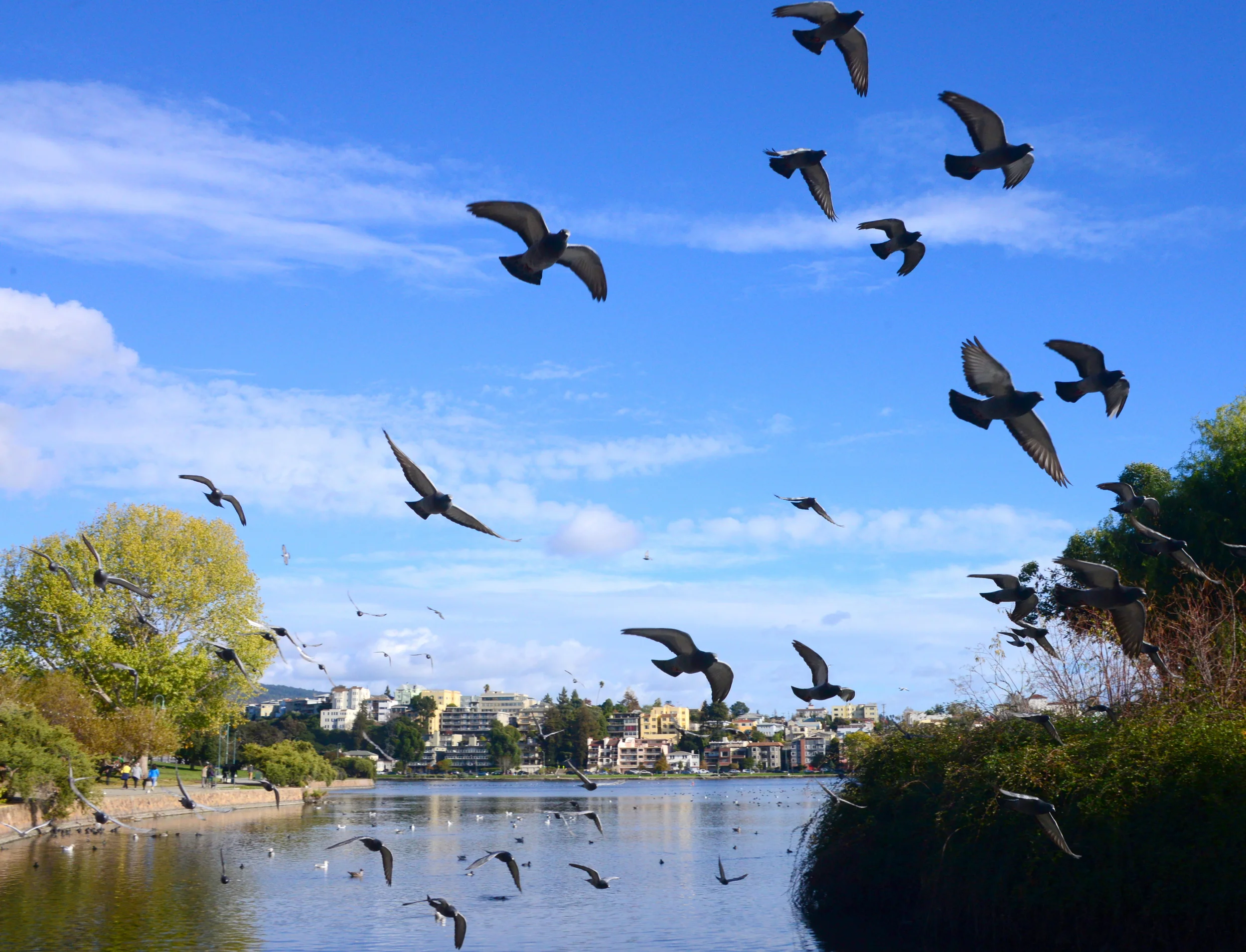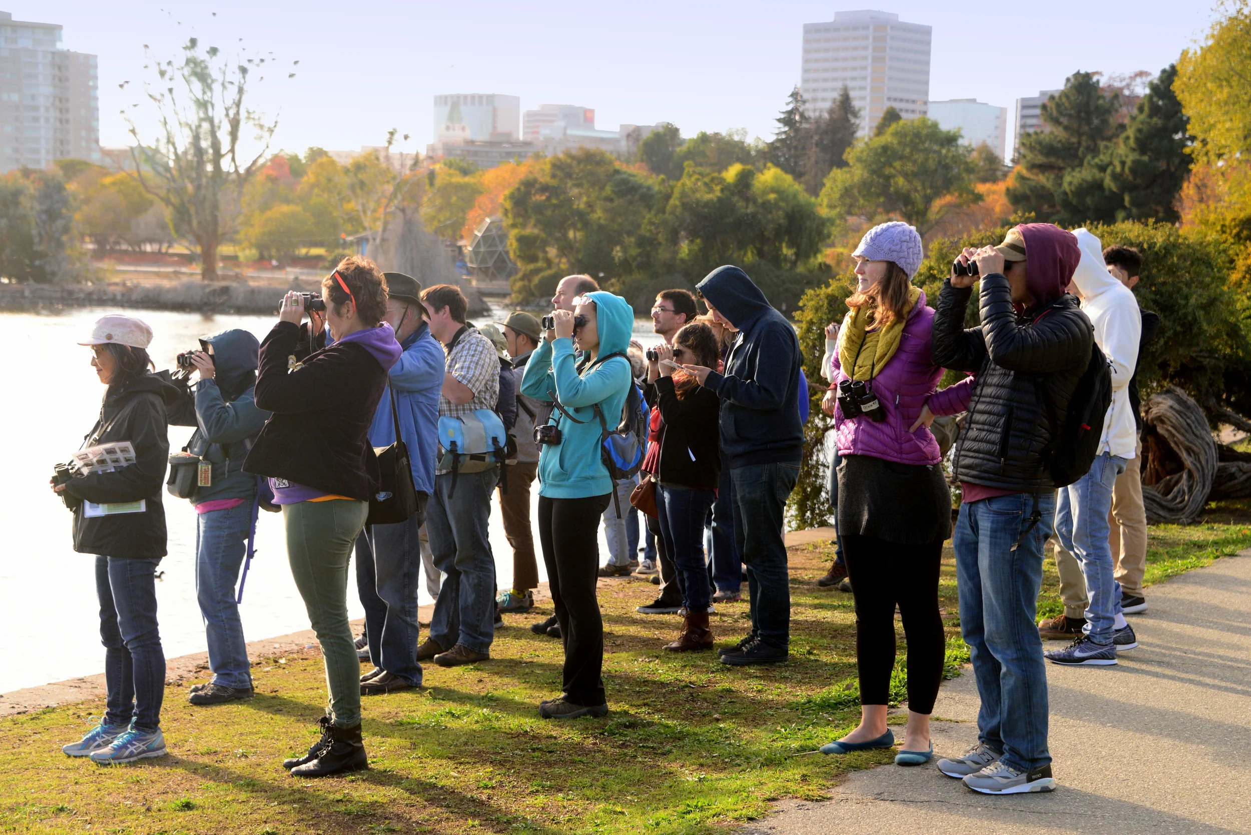 /A wall of feathers swooped up before the crowd as a flight of Rock Pigeons swam through the cool golden light of a mid-November afternoon like a frightened school of fish in the waters below. Constance Taylor, the event coordinator, instructed the onlookers to see if they could spot a raptor driving after the birds, as a juvenile Red-Shouldered Hawk has been reported recently in the area. On the two-hour beginning birder walk, around 30 different bird species were spied by nearly 40 participants on Lake Merritt’s waters and in the gardens.