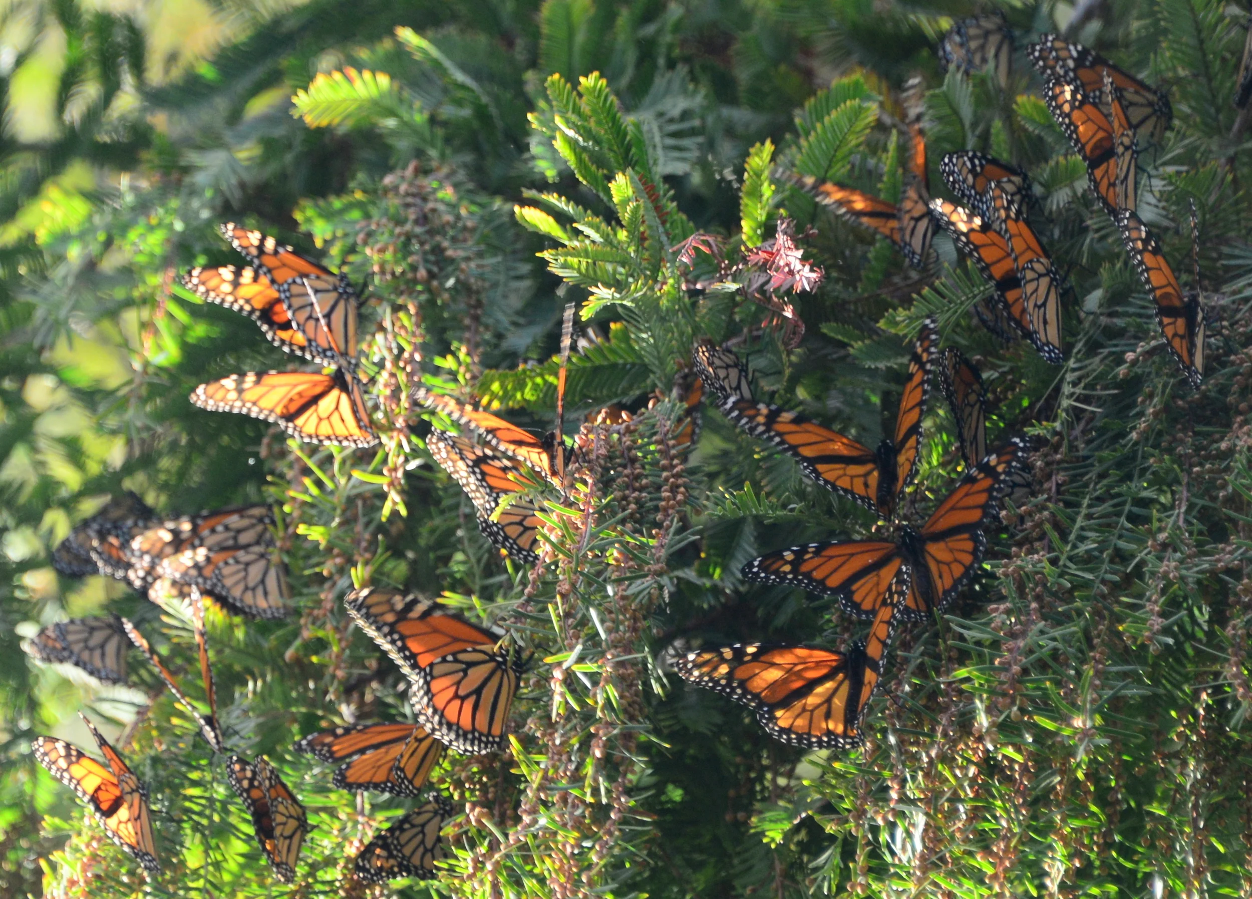 Inside the gardens the terrain is much different than the lake, and provides many hiding spots for smaller birds. Within moments of entering the gardens, a pair of territorial Anna's Hummingbirds put on quite a show. The males make a large swoop in the air punctuated with a loud chirp-like sound caused by the force of air over their tail feathers, and use this behavior to assert territory. A Bewick's Wren was spotted popping in and out of a hedge, and Yellow-rumped Warblers seemed to scamper about in most open spaces. The real winged treat in the garden wasn't a bird, but a cluster of monarchs aggregating on the branches of a Dawn Redwood. The monarchs have been actively cultivated in the gardens by the Pollinator Posse, and milkweed is planted throughout to help their striped caterpillars feed.